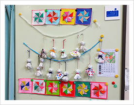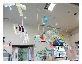 制作の時間に「てるてる坊主」、「風車作り」、「海の仲間を作ろう!」、「熱帯魚の窓飾り」、「七夕吹き流し」を作りました。海の仲間はシールやキラキラの折り紙等を貼り付け、様々な生き物を作りました。七夕の吹き流しは大きなものが出来上がりました。「夏到来」と涼しさを感じられると好評です。