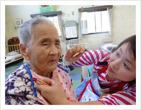 希望館デイサービスのアイデアと道具をお借りして、六郷デイサービスでも美容講座を開きました。月~金曜日の5日間はフェイスパックとハンドマッサージ、最終日の土曜日にはメイクアップレッスンを行いました。女性のみなさんが喜んでくださるのは想定内だったのですが、驚いたのは男性が楽しんでいらっしゃったこと。パックを気持ち良さそうにお顔に乗せて、手のマッサージにも真剣に取り組まれていました。