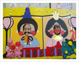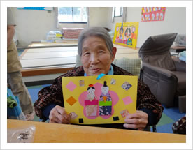 ひな人形の壁かけ飾りを作りました。「女雛だからね!」と着付けを意識され、お雛様の肩をなで型に折るなど工夫される方もおり感動でした。顔出しパネルでの撮影時はじゃんけんで役を決め、お内裏様には「ひげ」を、お雛様には「つけまつげと大きな唇」をつけて頂き、より魅力的に?撮れました。