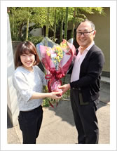 朝礼で職員一同からのお祝いの花束を贈らせていただきました。