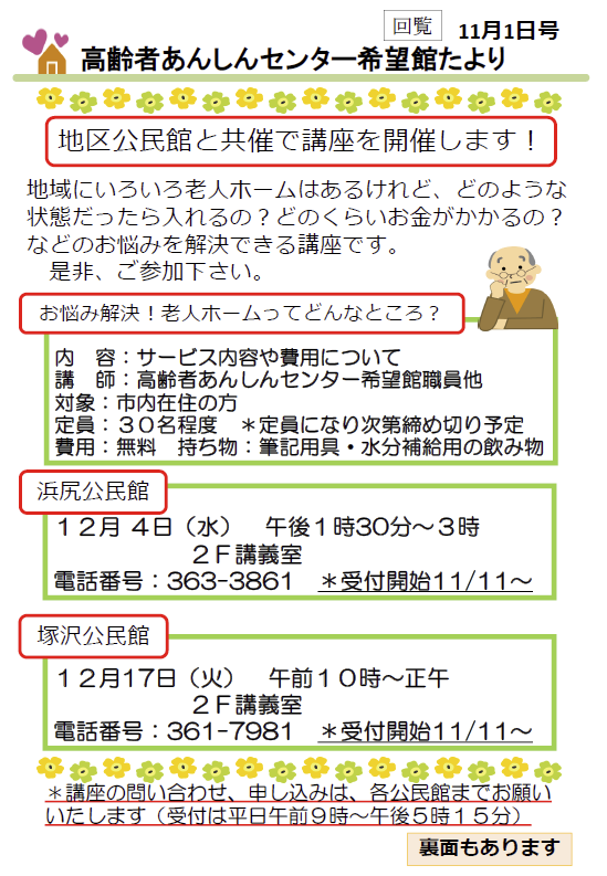11月17日、24日の2日間にわたり、高崎市中央公民館主催の「がんばり過ぎない家庭介護講座」が希望館で開催されました。