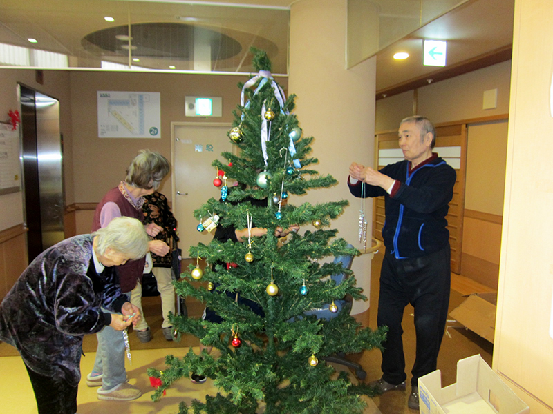養護老人ホームのクリスマスは、背丈よりも高いクリスマスツリーの飾り付けからはじまります。12月になるとすぐに職員も一緒にオーナメントの飾り付け。