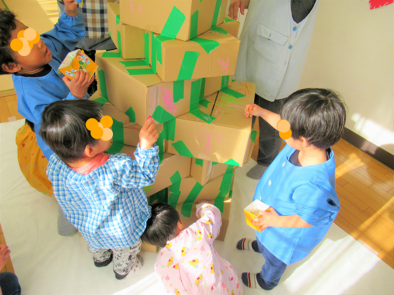 段ボールを重ねて、色を塗って、糊でペタペタ飾りをつけて…