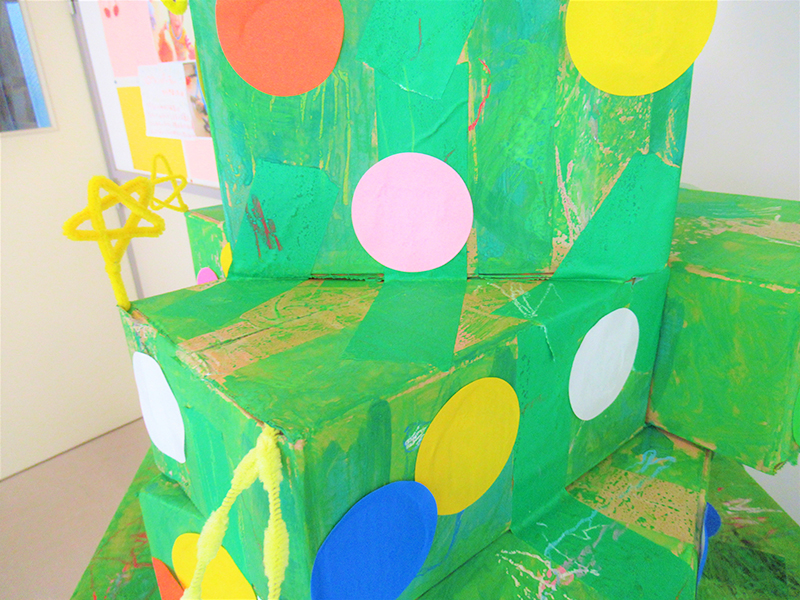 絵の具でツリーだけでなく、手足や髪の毛まで緑に塗ってしまうこともありましたが、一生懸命作りました。最後に星を乗せて、子ども達の背よりも大きな大きなクリスマスツリーが完成!