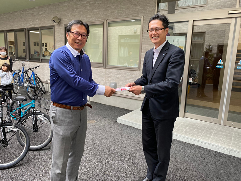 2月15日、スズケン様より各ユニットに1台ずつ、小学生用の自転車の寄贈がありました。まず全員が中庭に集合し、寄贈式を行いました。