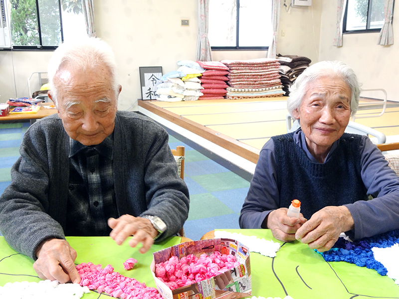 キャラクターの「ミライトワ」と「ソメイティ」の名前の由来を興味深い様子で聞いたり、1964年の東京五輪の思い出話で盛り上がりながら、ご利用者様も一大イベントに参加しています。