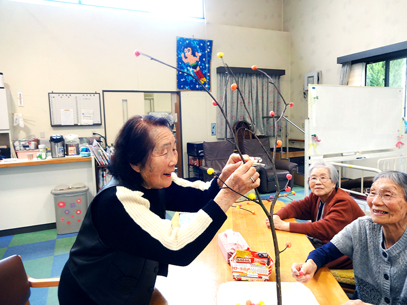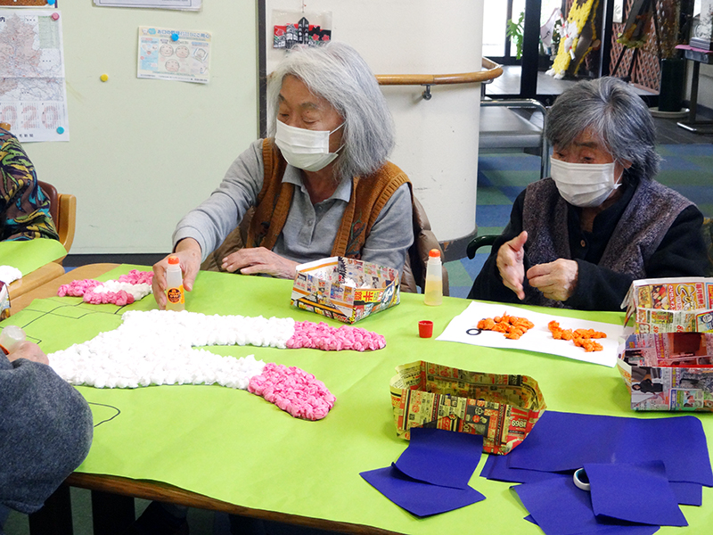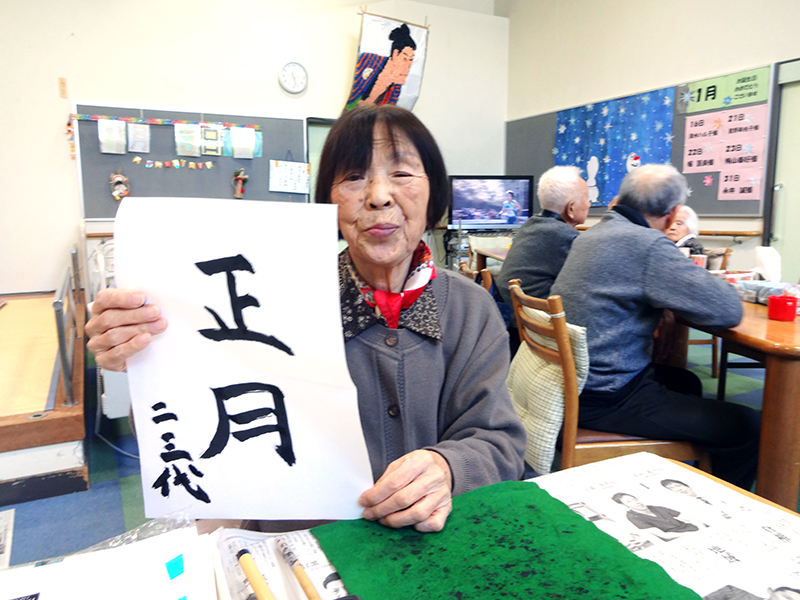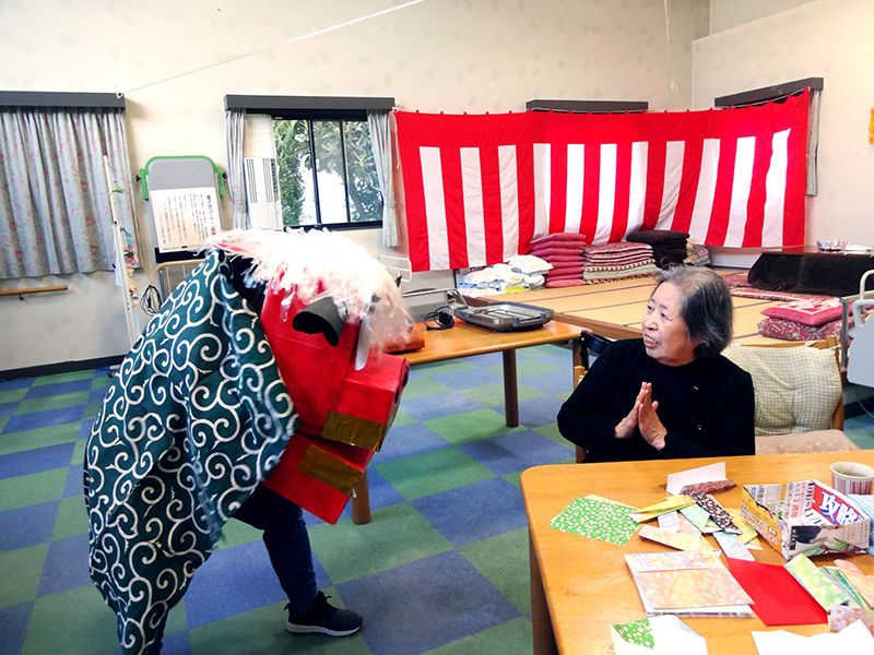 獅子舞で賑々しく新しい年を迎えました。そして書き初めを行い、小正月に向けて「まゆ玉」作りも行いました。まゆ玉はお飾り用とおやつ用を作り、彩りよく飾った後はおやつ用のまゆ玉を、あんこ・みたらし味で召し上がっていただきました。