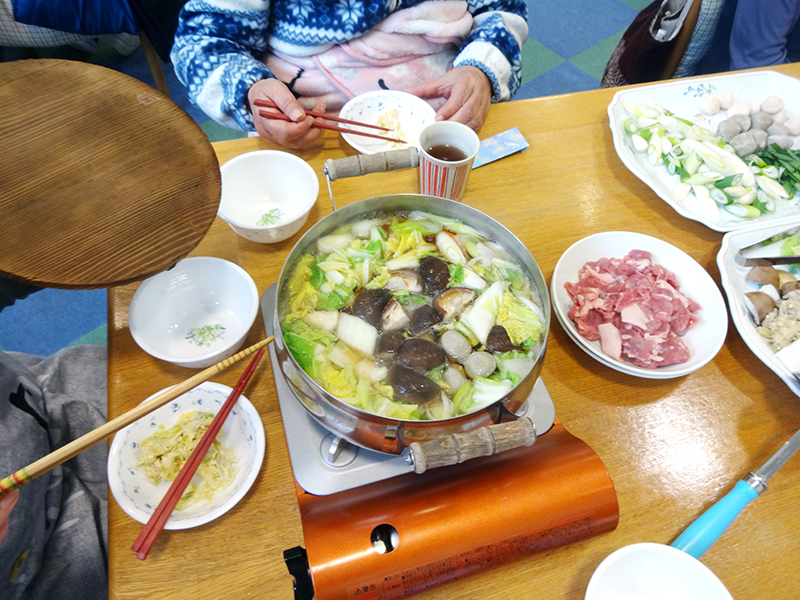 今年は暖冬とはいうもののやはり寒い日もあり、体の温まる鍋会食がご利用者の皆様にとても好評でした。「美味しいね!だしは何を使っているの?」などの質問もあり、美味しく豊富な食材を準備してくださった調理部門の皆さんにも感謝です。